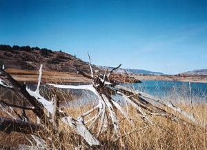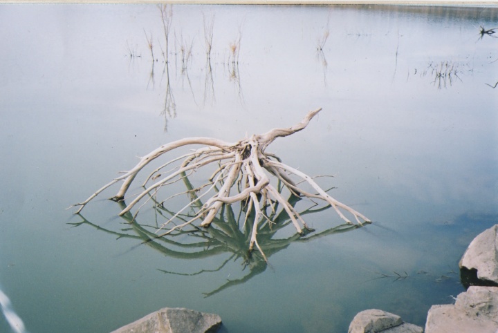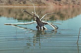 My current series or paintings and photographs, titled "Reflections Beneath Driftwood", explore the changing landscape of Abiquiú Dam, in Abiquiú, New Mexico, caused by a twenty year drought. They also capture large pieces of petrified driftwood that have blown off of the boulders surrounding the dam that have landed into the water.? From 2008-2015, I have documented the amount of driftwood that has been exposed to the light, because of the significant water level drop at Abiquiú Dam, which started long before 1995, when I first started visiting the dam.? Back then you could jump off of the large boulders into deep water without touching the bottom of the dam. As of 2015, you have to walk 400 yards from the boulders, on dry land, to get to the water's shallow edge; once there it is another 400 yards before reservoir water is over your head.