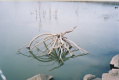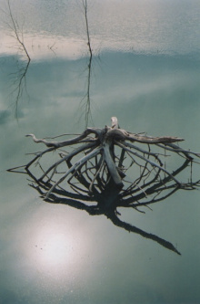 Paint is alsoused to break up the surface and add visual depth to the pieces. In the photographs, the driftwoods' reflection capture not only light, space,volume, colors, textures, but shapes, as well as reflect the stillness, or wind currents, on the surface of the water.? These large pieces of driftwood are stunning figures on top of the water with a complex visual story underneath.