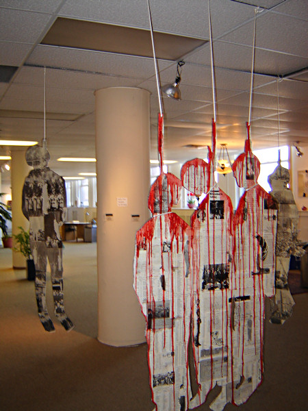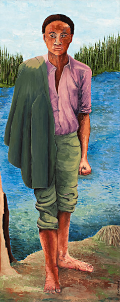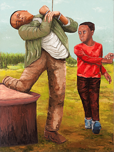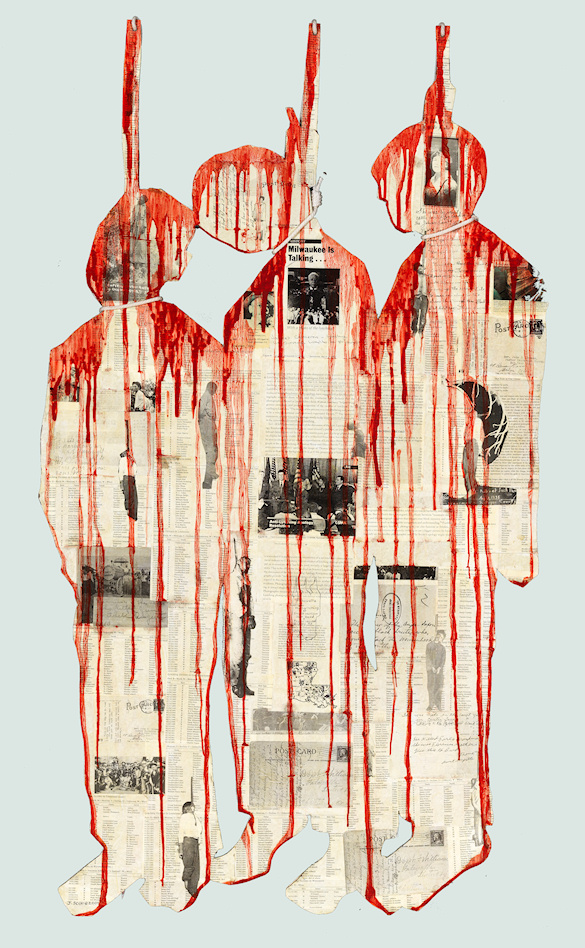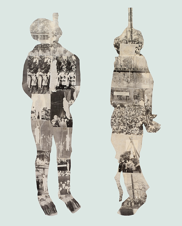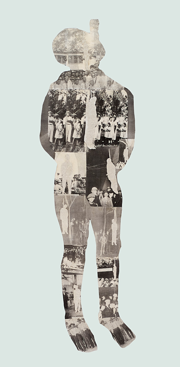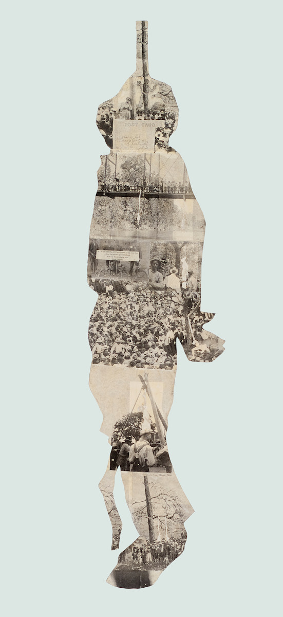 This series of paintings and collages respond to lynching postcards that were mailed around the country during the Jim Crow Era as souvenirs. Thousands upon thousands of African Americans were lynched between the 1880s and the Second World War. Over the years, I have thought about what I did not see in the postcards, primarily the family members left behind to take down the victim, to mourn and bury their remains if there was enough left to bury.