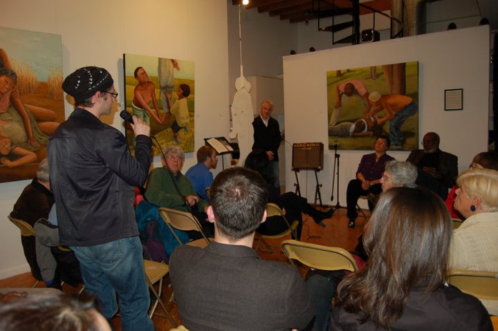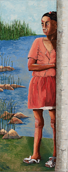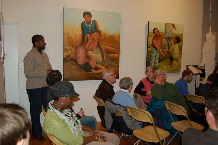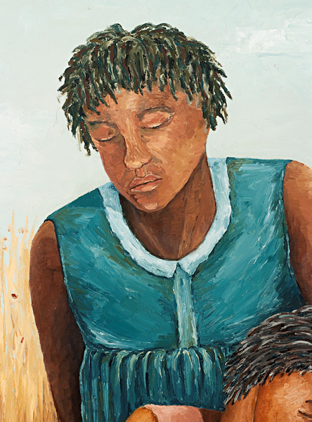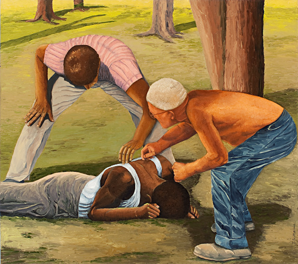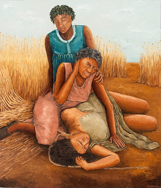 My piece ‘Three Generations’ examines the lynching of women during this time period. The painting is of a female victim who is down on her side, her skirt is wrinkled and close to her hips, and her head is tilted to the right. Her body is foreshortened so the viewer does not see the atrocity (rape) that took place before she was lynched. An older woman, leaning over the victim, is beside herself with anger and sadness. A middle-aged woman stands resolutely over the older women’s shoulder with a comforting hand on the woman’s hip. She holds in her pain and resolve to the event that took place hours before. We cannot see her anguish. We can only imagine it.